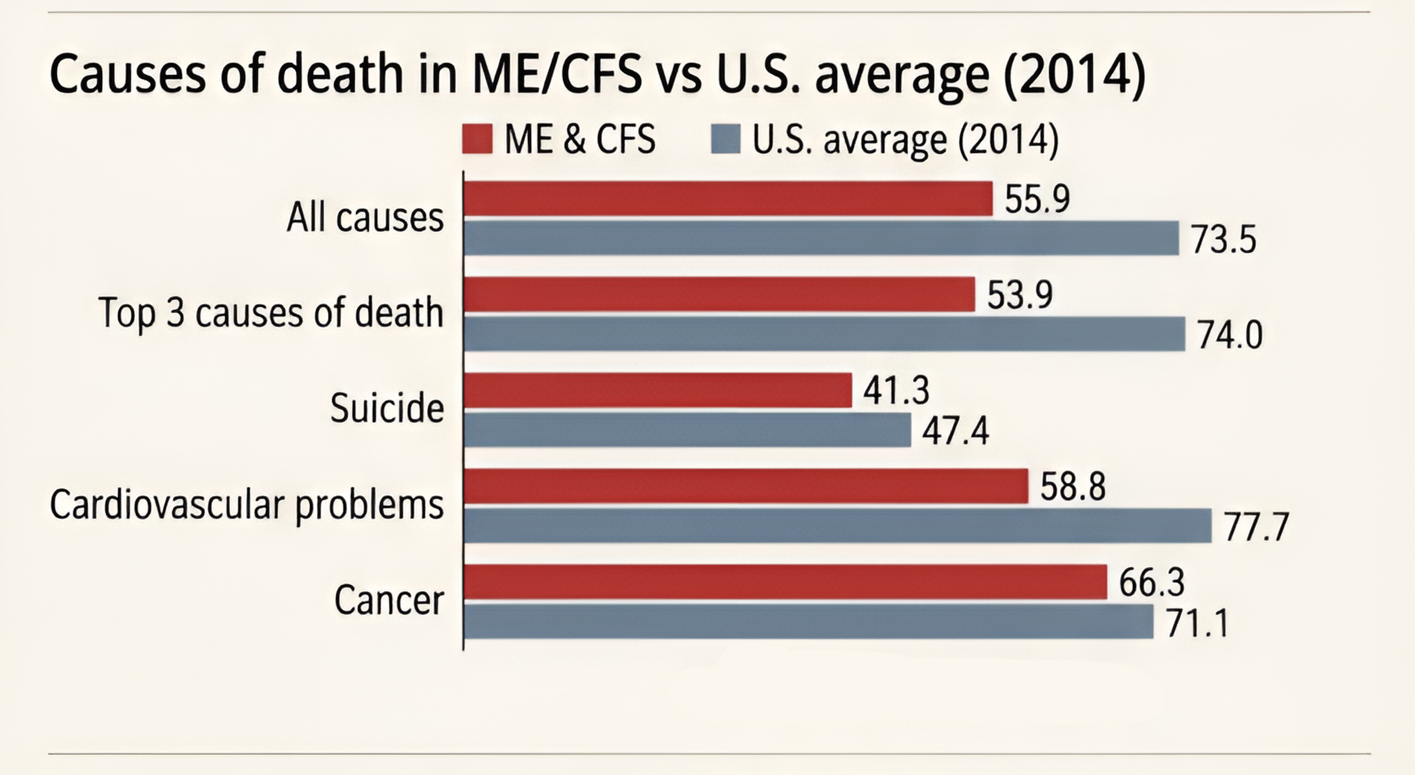 Causes of death in ME/CFS vs U.S. average (2014). Infographic based on mortality data comparing ME/CFS and U.S. average age at death across selected categories.