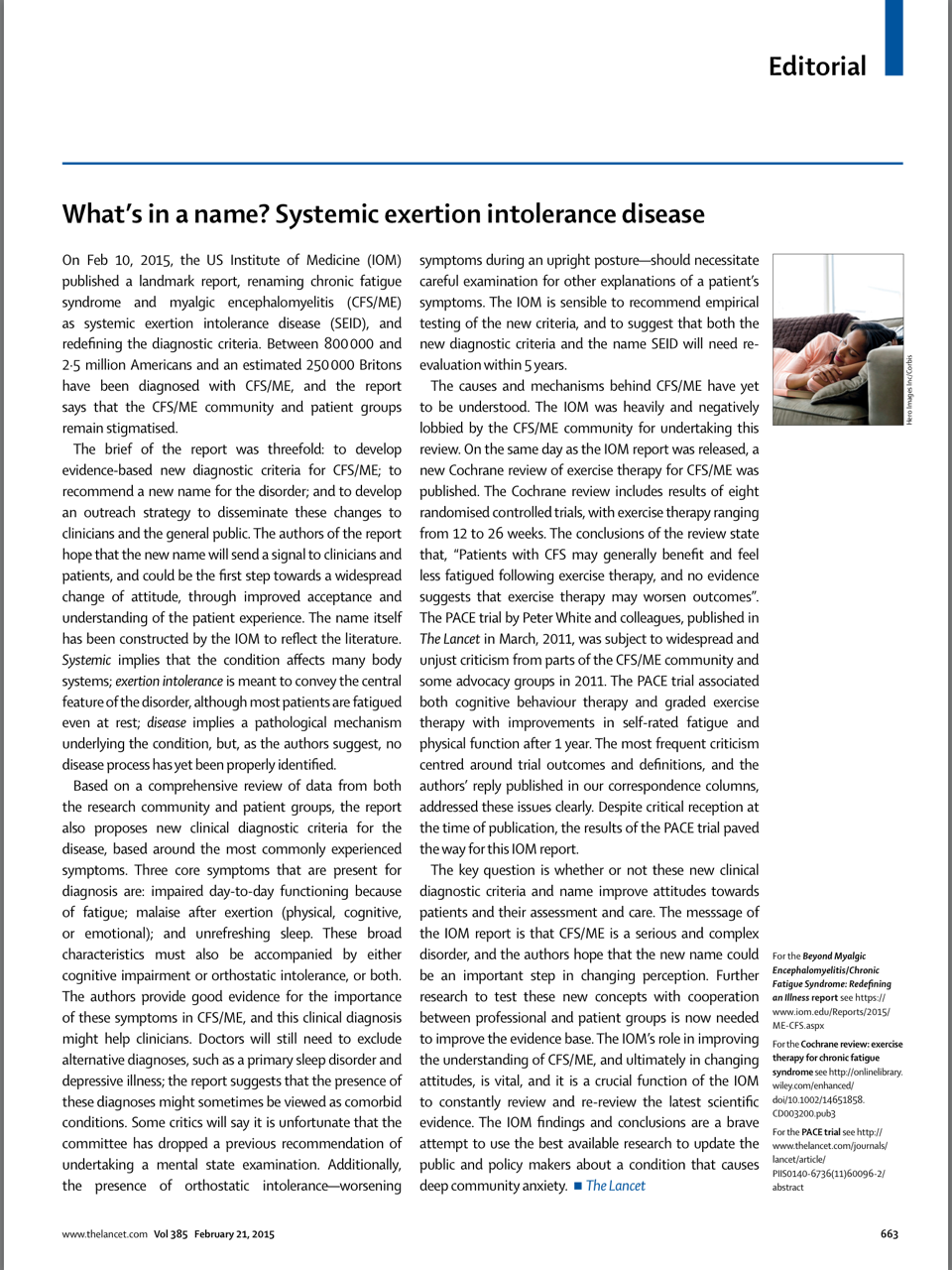 - What's in a name? Systemic exertion intolerance disease (The Lancet, 21 February 2015)