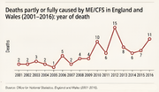 | 17:32, April 19, 2026 | Deaths caused by MECFS England Wales 2001 2016 year of death.png (file) | 4.05 MB | Tobiwankenobi (talk | contribs) | ==== Title: (or description) ==== Deaths partly or fully caused by ME/CFS in England and Wales (2001–2016): year of death. Infographic showing the yearly number of deaths across the period 2001 to 2016. ==== Author: (or citation) ==== Tobiwankenobi. Own infographic created for MEpedia. ==== Source: (e.g. internet address) ==== https://www.ons.gov.uk/peoplepopulationandcommunity/birthsdeathsandmarriages/deaths/adhocs/008461mentionsofpostviralfatiguesyndromebenignmyalgicencephalomyelitisde... | 1 | |